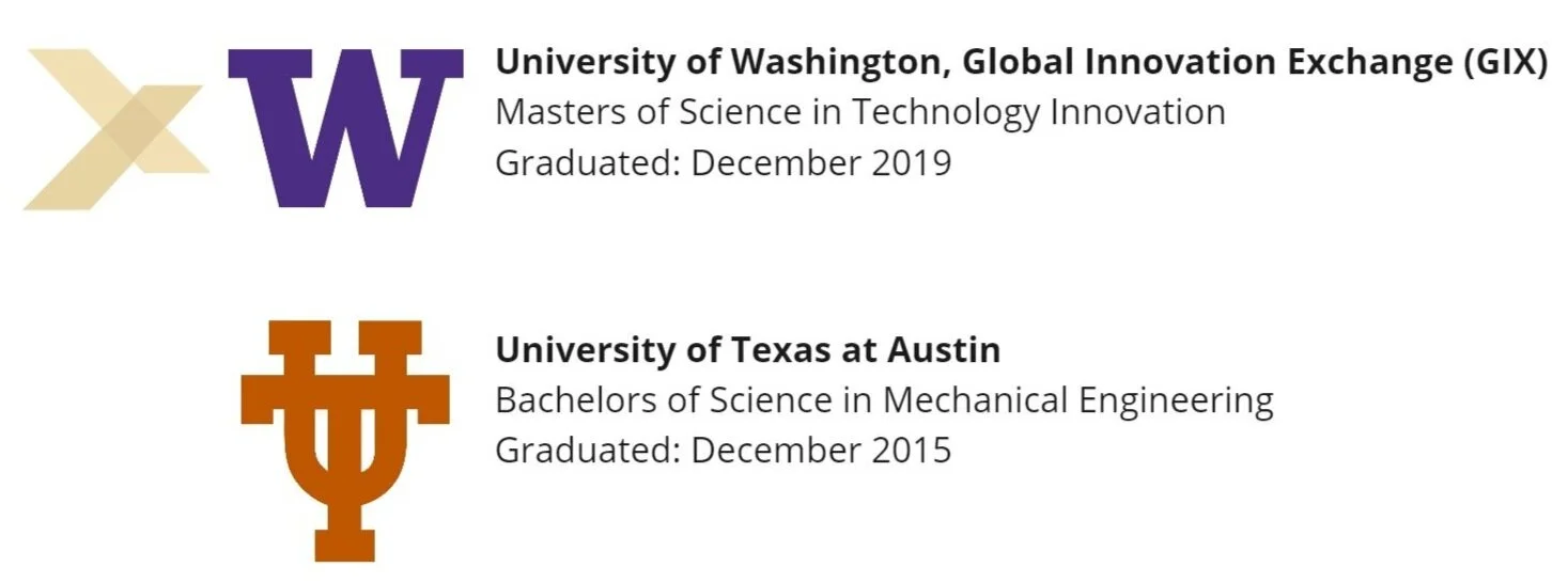 I’m a recent graduate of the Masters of Science in Technology Innovation (MSTI) program at The University of Washington. During the program, I practiced user research, UX design, market research, and engineering through technology development projects. I focused on the UX research and design of machine learning applications and connected devices.